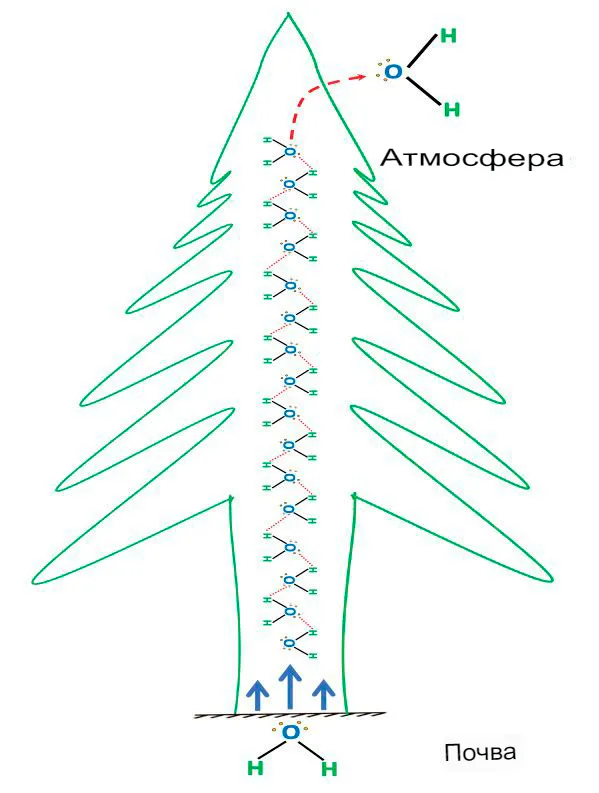 Вода перемещается от почвы к вершинам деревьев (например, в секвойях это около 90–100 метров) благодаря механизму когезионного натяжения. Когезия между молекулами воды обусловлена водородными связями, а натяжение создается за счет испарения воды во время транспирации растений. Когда вода испаряется, она «тянет» за собой следующие молекулы воды, чтобы восполнить потерю жидкости в ходе испарения (McElrone, 2013). Когезионныесилы, обусловленные водородными связями, показаны на Рисунке 2.