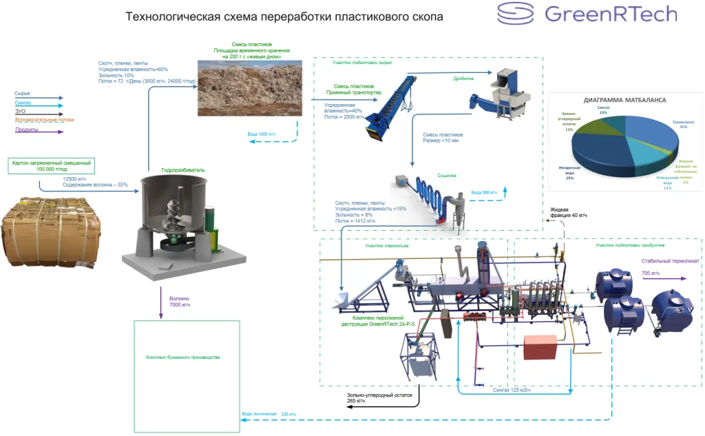 Данная схема иллюстрирует пример с переработкой 100 000 т/год макулатуры. Технология извлечения целлюлозы и полезных продуктов из макулатуры может отличаться, в зависимости от специфики переработки. Однако усреднённый отход технологии переработки – поток пластиковых отходов в объеме 24000 т/год. В общем случае этап подготовки сырья заключается в измельчении пластика до 10-15 мм и его глубокой сушке. Источник тепла сушилки – побочные продукты комплекса GRT. Однородная масса с влажностью до 15% поступает на второй этап переработки – термическую деструкцию. Под действием температур до 500 ОС и в отсутствие кислорода, полимеры деструктируют на парогазовую смесь и зольно-углеродный остаток. При этом все не полимерные примеси, в том числе краски, остатки клеев, резина, минеральные включения, песок и проч. так же деструктируют. Охлажденный зольно-углеродистый остаток потоком 265 кг/ч применяется в качестве технического грунта. На участке подготовки продукции парогазовая смесь подвергается многоступенчатой очистке с выделением тяжелых фракций и их повторной деструкцией, поэтапной системой конденсации, сепарирования и охлаждения при различных температурах, дополнительной подготовке и очистке от воды. Охлажденная жидкость накапливается в выходных емкостях и подлежит подготовке для дальнейшей коммерческой реализации. Жидкость соответствует ТУ производителя пластиков и может использоваться для повторного производства полимеров в качестве сырья. Произведенный поток термолизата – 700 кг/ч (5600 т/год). Не сконденсировавшиеся охлажденные топливные газы, проходя дополнительную очистку, поступают на горелки GRT установки и используются для поддержания постоянной температуры в реакторе. Объем топливного газа – 125 м3/ч. Вода, (поверхностная, поступающая извне с сырьем, и химически образованная от остатков целлюлозы) конденсируется, очищается и выводится как побочный продукт – техническая вода, которая после комплексной очистки и подготовки может быть возвращена в цикл переработки картона потоком до 230 кг/ч.