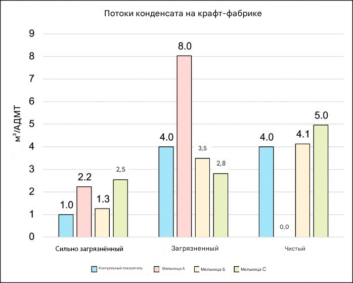 Как правило, крафт-целлюлозный завод производит примерно 9 м³/ADMT вторичного конденсата. Однако из этого объема только 3-6 м³/ADMT чистого и стриппированногоконденсата могут безопасно повторно использоваться для промывки целлюлозы без риска загрязнения.