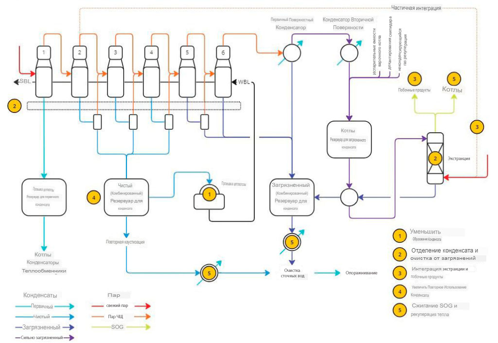 Частичная интеграция предполагает использование пара, образующегося при испарении черного щелока (преимущественно в высокотемпературных эффектах – первом или втором), в сочетании с насыщенным паром для экстракции конденсата. Такой подход максимизирует эффективность использования пара в процессе испарения.