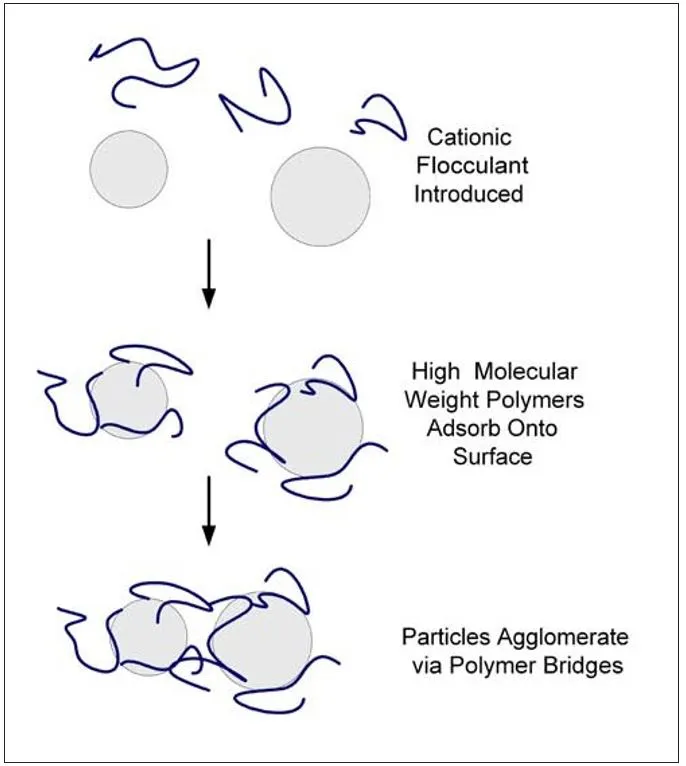 Мостиковая флоккуляция проиллюстрирована на рисунке 3. В этом механизме желаемая адсорбированная конформация полимера на частице включает длинные петли и хвосты. Эта конформация полимера зависит как от заряда поверхности частицы, так и от плотности заряда полимера. Полимеры для мостиковой флоккуляции характеризуются высокой молекулярной массой и низкой плотностью заряда. Флоккулы, которые образуются, крупные и объемные. Они имеют плохую стабильность к сдвигу и не восстанавливаются в значительной степени после разрушения.