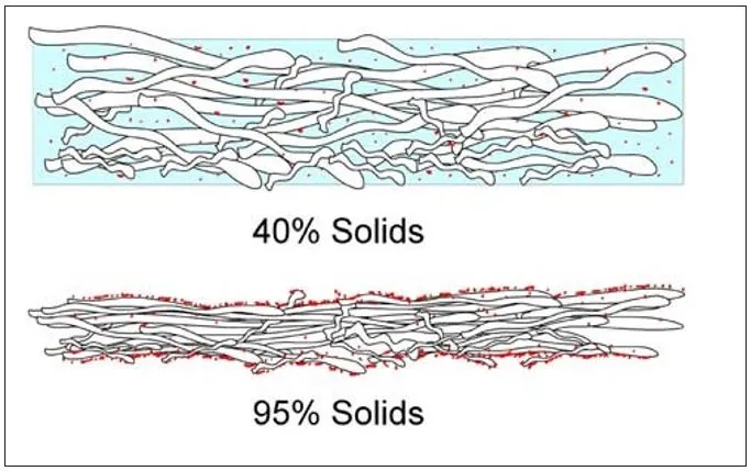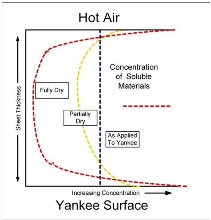 Когда вода испаряется с поверхностей листа, растворимые органические и неорганические вещества, а также мелкие коллоидные материалы в воде остаются позади. Подобно выводам Дрешфилда о растворимом красителе, рисунок 7 концептуализирует концентрацию растворимых материалов на обеих сторонах листа – на стороне янки и открытой (воздушной) стороне. Эффект обратен тому, что показано на рисунке 6. Еще один способ визуализировать этот процесс показан на диаграмме на рисунке 8. Здесь растворимые материалы изображены красными точками, и показана концентрация из водной фазы на поверхности листа. Добавление этих материалов в пограничный слой покрытия на янки дополнительно изображено на рисунке 9. Теперь становится очевидным, как большинство производителей тиссью признают, почему увеличение сушки на янки (по сравнению с сушкой в камерах) может привести к увеличению естественного покрытия на сушильном цилиндре. Полная сушка на янки-цилиндре аналогична первоначальным экспериментам Дрешфилда, что приводит к большему испарению и осаждению растворимых материалов на закрытой поверхности. Увеличение сушки с использованием камер приведет к большему испарению воды с воздушной стороны листа и меньшему развитию естественного покрытия на поверхности янки-цилиндра.