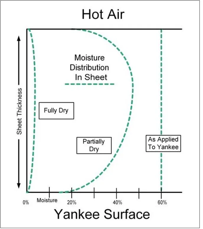 Работы Дрешфилда по сушке бумаги на горячей поверхности показали, как вода движется изнутри листа к обеим его поверхностям, где происходит испарение. Благодаря данным о миграции красителя и распределении влаги он смог показать, что максимальное содержание влаги содержится в зоне примерно 20–30% от общей толщины листа, с той стороны листа, которая была подвергнута воздействию открытого воздуха. Минимальное содержание влаги наблюдается на закрытой поверхности листа, контактирующей с нагретой металлической поверхностью (сушильной). Второе минимальное содержание влаги наблюдается на открытой поверхности. Эти результаты показаны на рисунке 6. Предполагая приблизительно равномерное распределение влаги по направлению Z в листе, выходящем из давления на вальце, рисунок 6 показывает распределение влаги в листе от поверхности янки к воздушной стороне.