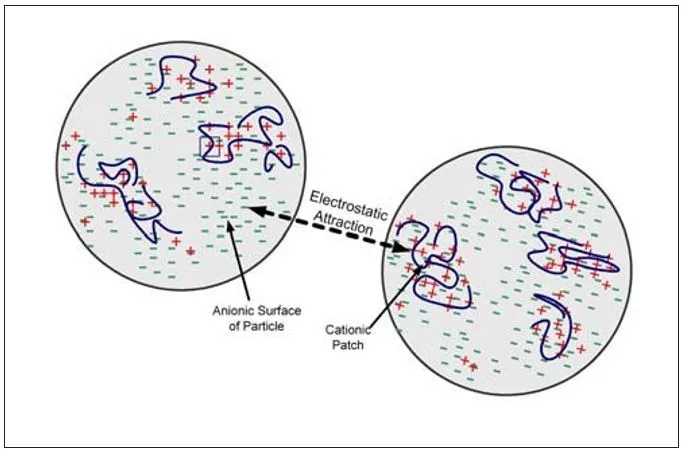 Флоккуляция «патчами» описывает механизм флоккуляции, при котором полимер адсорбируется на поверхности частицы, образуя катионный участок («патч»). Как показано на рисунке 2, на одной частице сосуществуют катионные и анионные поверхности. Флоккуляциямежду частицами происходит из-за электростатического притяжения между двумя противоположно заряженными поверхностями. Степень притяжения зависит от плотности заряда катионного полимера и степени покрытия поверхности. Полное покрытие и нейтрализация не требуются для возникновения флоккуляции «патчами», и на самом деле могут привести к повторной дисперсии частиц. Полимеры, которые являются хорошими флокулянтами «патчами», характеризуются короткими или средними молекулярными массами и высокой плотностью заряда. Они должны уметь выходить за пределы электрического двойного слоя частицы, чтобы быть эффективными. Флоккулы, которые формируются, обычно маленькие и компактные. Эти флоккулы также могут восстанавливаться после разрушения, вызванного сдвигом. То есть, флоккуляция обратима.