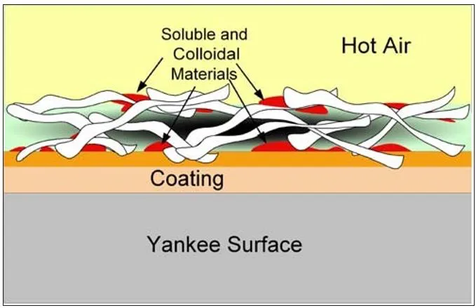 Предыдущие исследования и обзорные статьи показывают важность этих естественных компонентов покрытия для его формирования. Оливер изложил возможные механизмы формирования природного клеевого слоя в мокрой части БДМ. К ним относятся (a) образование клеевой пленки из растворенных и диспергированных гемицеллюлоз по мере того как вода испаряется на поверхности сушильного цилиндра янки; (b) перенос небольших фибриллярных материалов и мелких частиц волокон с листа на липкую клеевую пленку; и (c) поток и перенос гемицеллюлоз, покрывающих внешние части волокон, на поверхность сушильного цилиндра под воздействием тепла. Механизмы (a) и (c), описанные для гемицеллюлоз, также применимы к добавкам, используемым на мокрой части, таким как смолы для повышения прочности. Также можно представить, что fines, описанные в механизме (b), покрыты гемицеллюлозами и/или добавками для мокрой части, которые также способствуют формированию покрытия.
