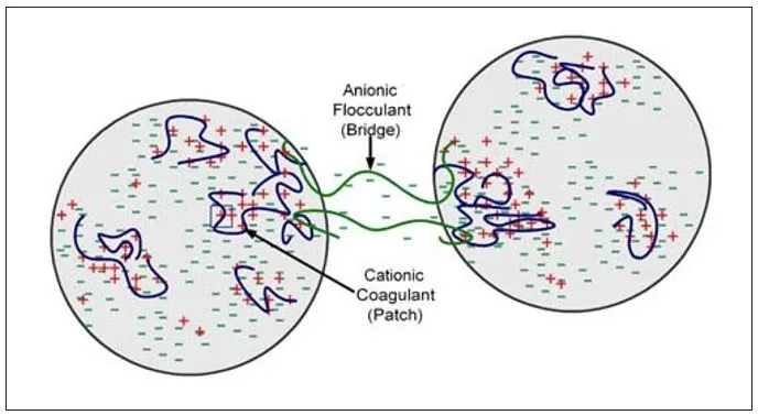 Из сложных механизмов флоккуляции, перечисленных в таблице 1, здесь будут обсуждаться только первые два. Как следует из названия, механизм «патч/мостик» является комбинацией уже обсужденных моделей «патч» и «мостик». Классический пример комплексной флоккуляциитипа «патч/мостик» – это двойная полимерная программа, состоящая из низкомолекулярного катионного коагулянта с высокой плотностью заряда в комбинации с высокомолекулярным анионным флокулянтом (см. рисунок 4). Флоккуляция зависит от электростатического притяжения катионных патчей к анионному мосту. Важные факторы во взаимодействии включают порядок введения двух полимеров, а также временной интервал между их введением.