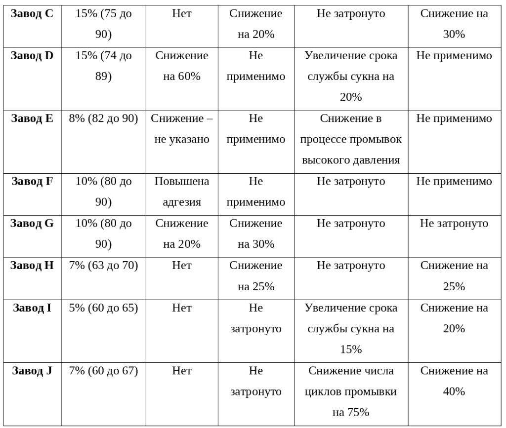 Таблица 2. Результат опроса 10 производств, использующих добавки для удержания волокна